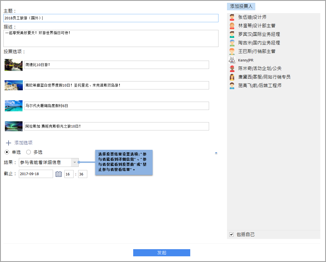 - 填写投票信息、添加投票参与者和设置投票结果限制及截止日期。