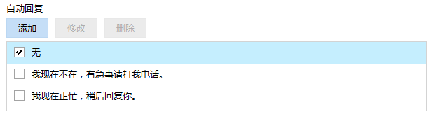 图示为默认自动回复;用户可以添加、修改和删除自定义的自动回复内容。