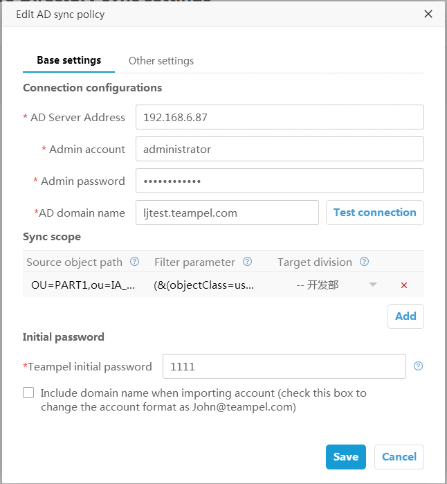 - Click "Create policy" to open "Add AD sync policy" dialogue box.AD Server Address:Active Directory Domain Controller IP Address. Admin account:Account can access AD Server. Admin password:Password can access AD Server account. AD domain name:AD Server domain name, with a general format as: teampel.com. Sync scope:Each record is a sync rule, including Source object path (DN), Filter parameter and Target division.To specify which division nodes or users in AD server will be synced to which division of Teampel.Each sync policy includes at least a sync scope. Teampel initial password:Accounts synced to Teampel system need initial passwords so to sign in Teampel client when login password is required. Other settings:AD user's property in AD can be set to match with member property in Teampel. E.g., sync "displayName" property value of AD user to "Name" property of Teampel member."Auto sync" can be set up so the system will sync AD at the set time automatically.