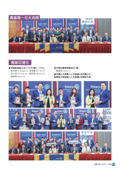 高雄南一社大合照 高雄亞灣社 ¼保羅哈里斯之友 PHF共5顆 (☆PHS) ¼中華扶輪教育基金共1顆 蕭志維 P. Ralph X1 張家豪 PP. Joe X1 雷韻蓉 Doris X1 葉士銘 PP. Sid X1 楊舜雯 Wendy X1 ¼扶輪之子認養 6人共認養4名扶輪之子 雷韻蓉 Doris X1 ¼慢飛天使認養 4人共認養4名慢飛天使 總監月報 2025年11月號 59